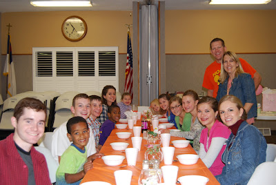 At the beginning of our party, we ate the delicious dinner Mrs. Henn served up; a hearty beef-stew she had "quintupled" (We decided that was the word to use when multiplying a recipe times five).
